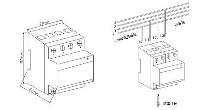 電源相線(L)、零線(N)分別接入電涌保護(hù)器相應(yīng)接線端子,保證牢固及可靠,將避雷器接地端與防雷地線(推薦接地電阻≤4Ω)作良好電氣連接。