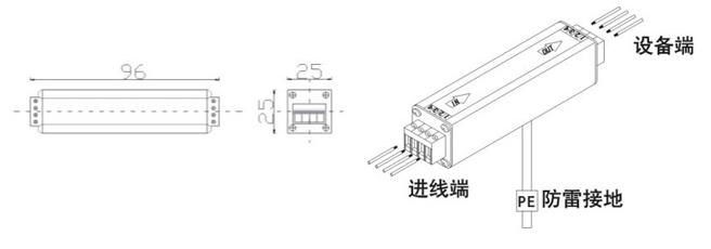 在被保護(hù)設(shè)備的線路接口前端串聯(lián)接入避雷器,“OUT”為設(shè)備端、“IN”為進(jìn)線端,將避雷器接地端與防雷地線(推薦接地電阻≤4Ω)作良好的電氣連接。