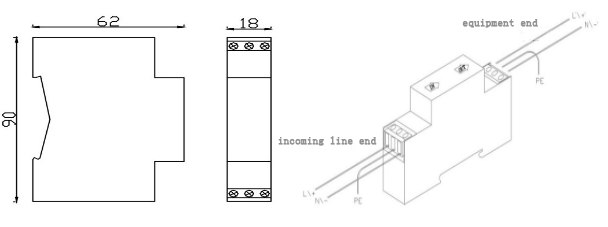The phase line (L)(+) and zero line (N)(-) of the power supply are respectively connected with the corresponding terminals of the surge protection device, and the firmness and reliability shall be ensured; the grounding end and the lightning protection ground wires (preferred the grounding resistance4Ω) of the lightning arrester are given good electric connection.